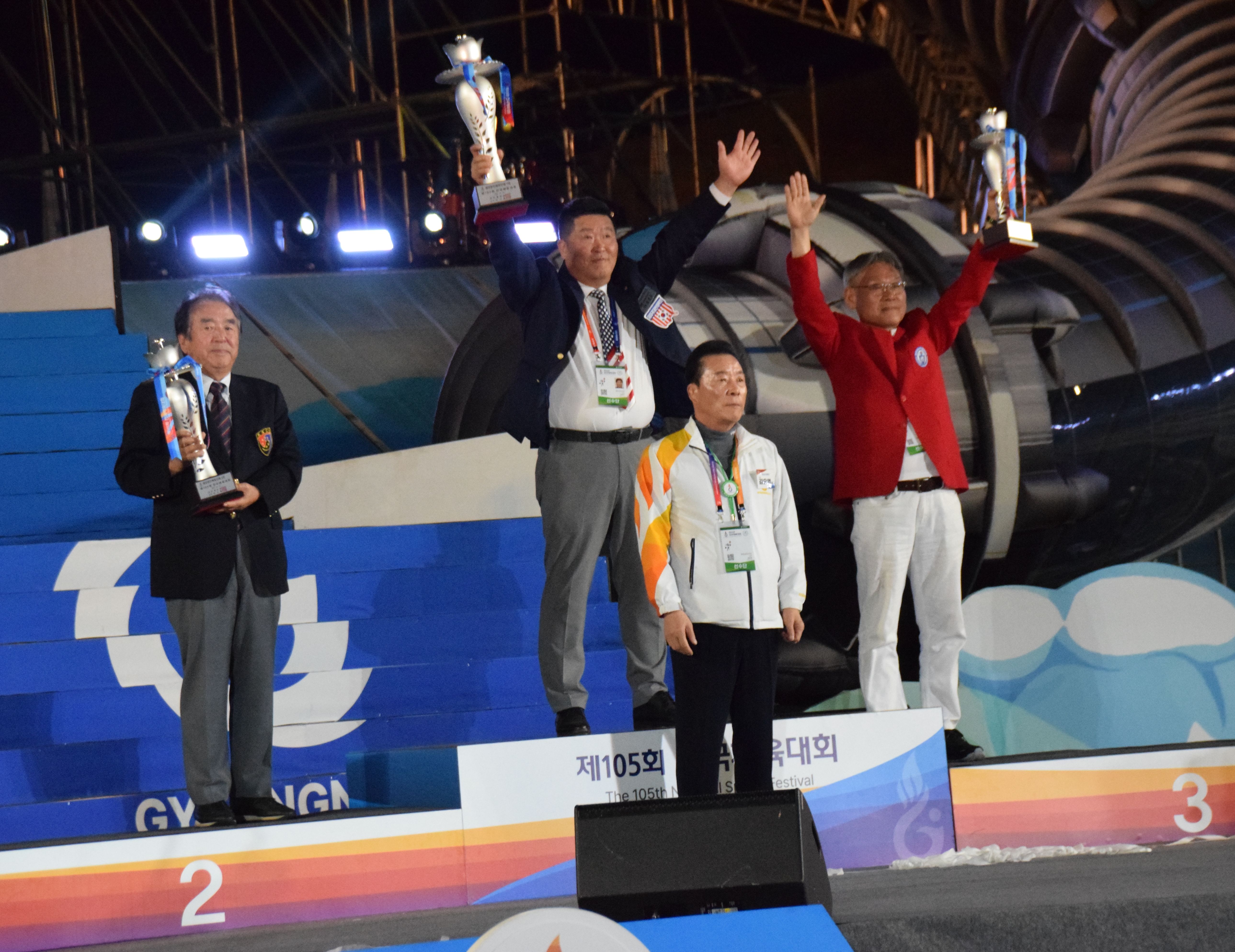 表彰式で準優勝トロフィーを手にする呉公太・在日同胞選手団長(左)