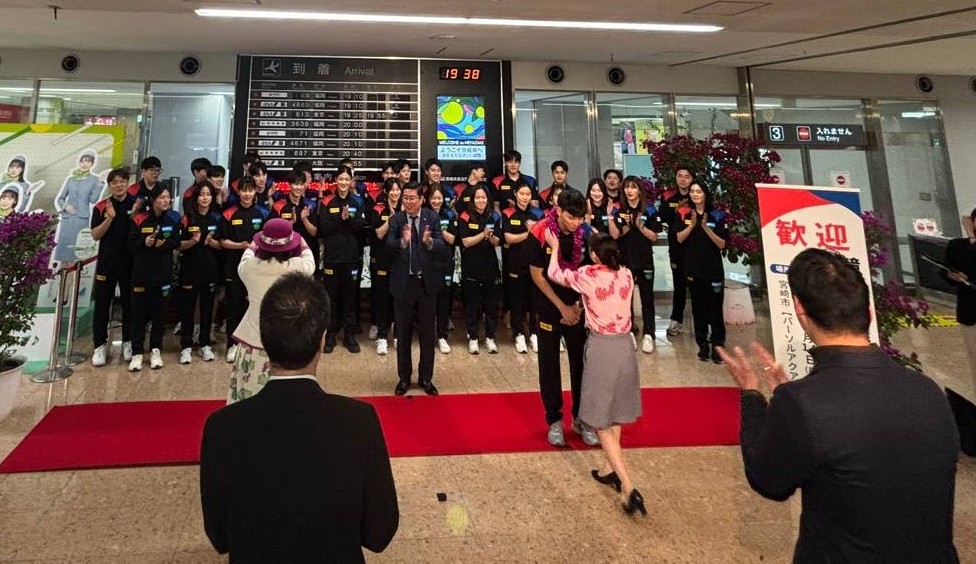 13日、仁川空港から宮崎ブーゲンビリア空港に到着した韓国チームは、到着ロビーで待ち受けた宮崎県と宮崎市の関係者らの歓迎セレモニーを受けた。