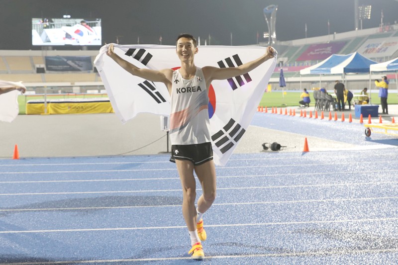 優勝して太極旗を両手にウイニングランをする禹相赫(写真:大韓陸上連盟)