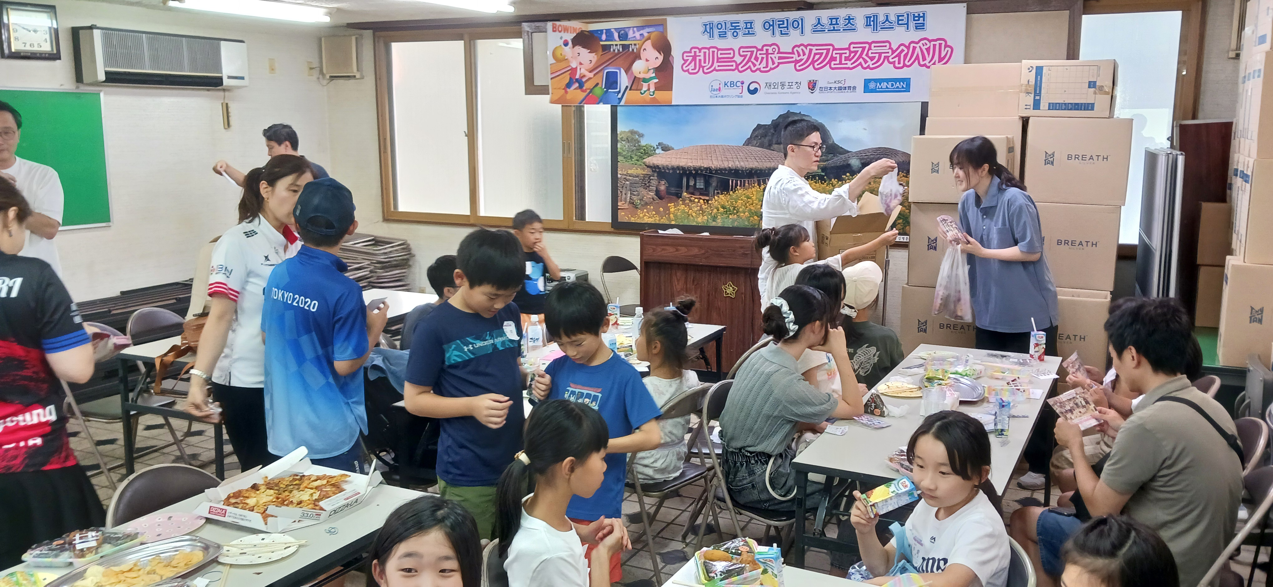 ボウリングを終えた後、民団荒川支部会館に会場を移してオリニ交流会。準備されたピザやおにぎりセット、菓子類を食べた後、民団が主催しているオリニジャンボリーの映像視聴やビンゴゲームなどを楽しんだ。