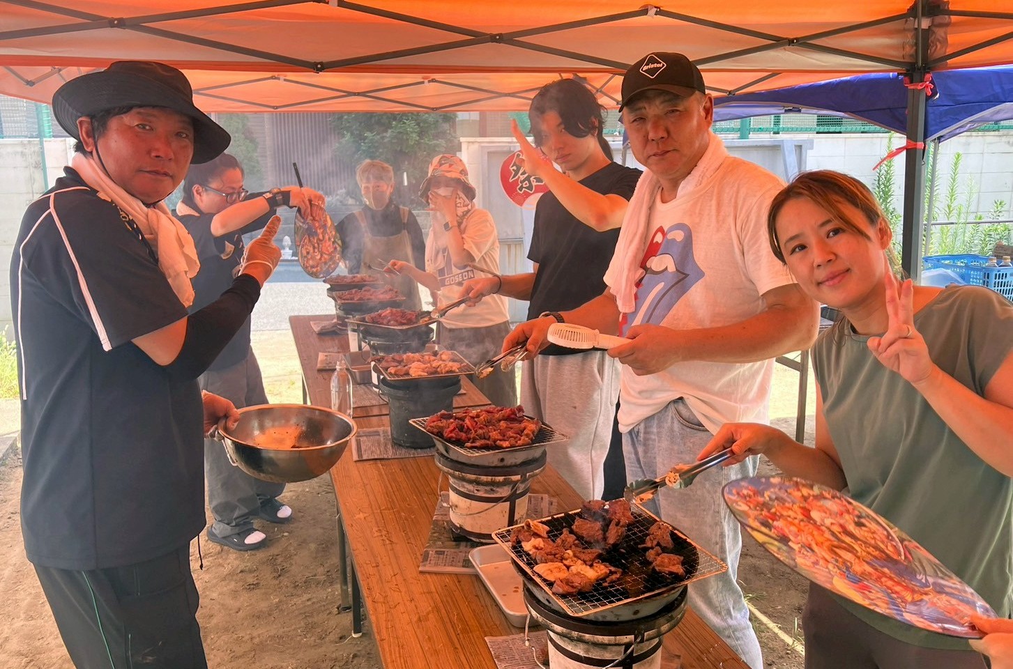 七輪で本格的な焼き肉を振る舞う嚴将守会長(左)とスタッフたち