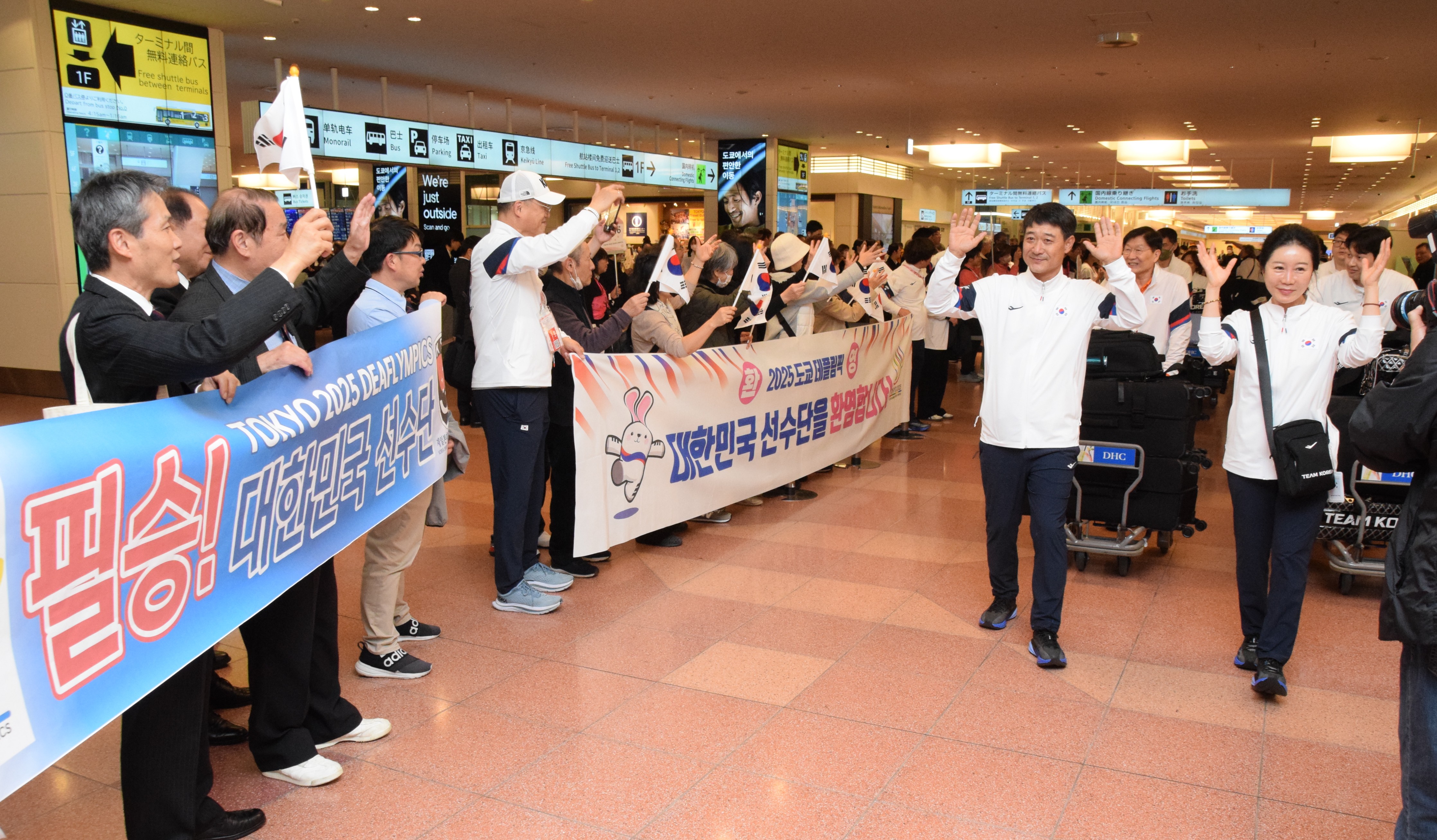 体育会関東本部と民団東京本部、青年会東京本部にあわせて品川支部、大田支部の役員ら約30人が羽田空港第3ターミナル到着ロビーで、「必勝!大韓民国選手団」との横断幕を広げ、太極旗を振りながら韓国選手団を出迎えた。