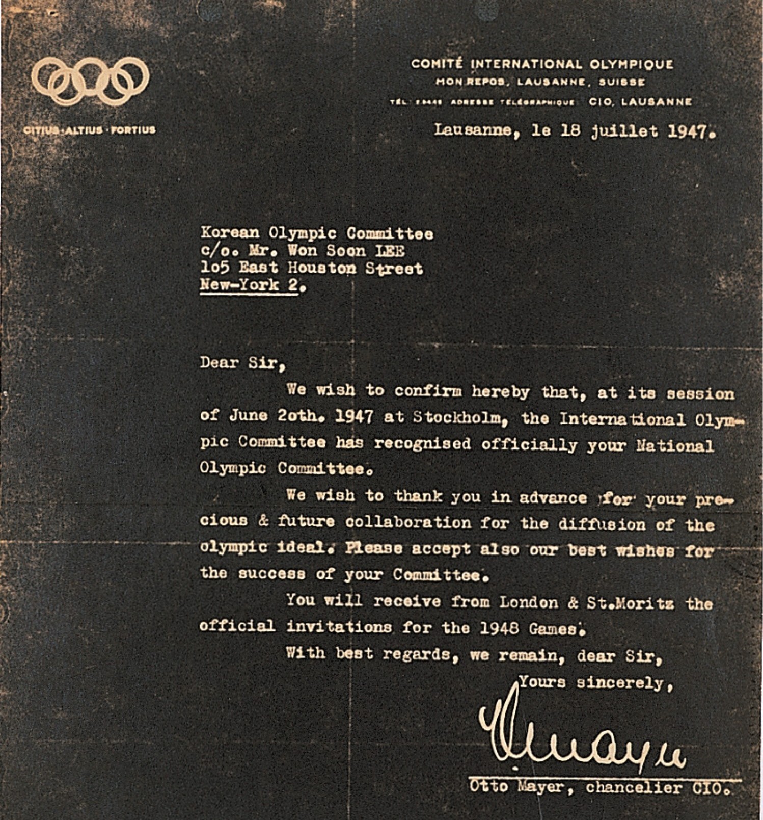 李元淳はKOCという組織に対する詳細な年代記的説明とアマチュア精神に基づいた運営原則、IOC憲章順守の意志などについて演説し、その結果、1947年6月20日のIOC総会で委員の満場一致でKOCは加入承認を受けることになる。