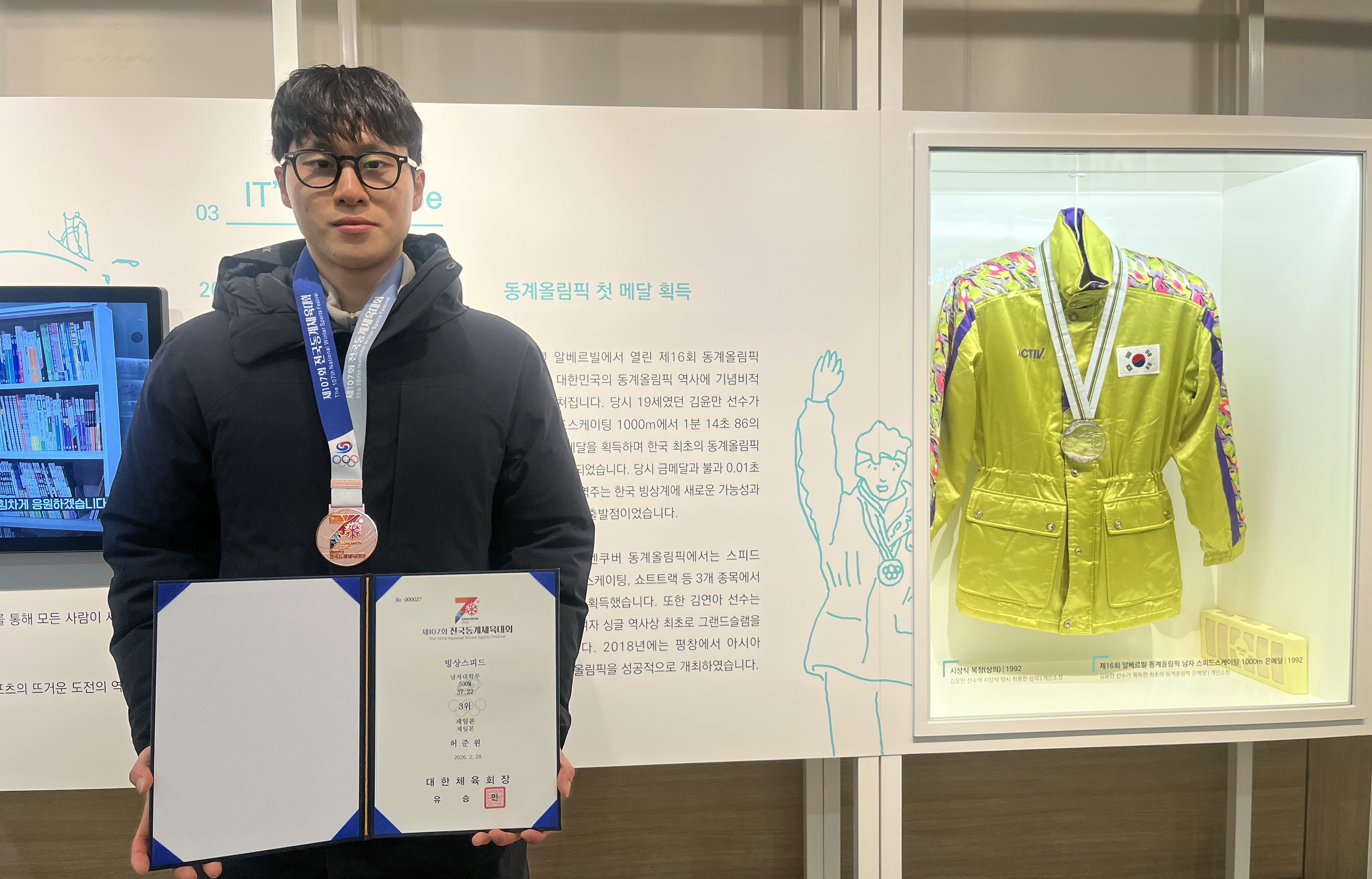 泰陵国際スケート場で開催している韓国冬季五輪挑戦史展示場前で銅メダルをかけて記念撮影する許峻瑗選手