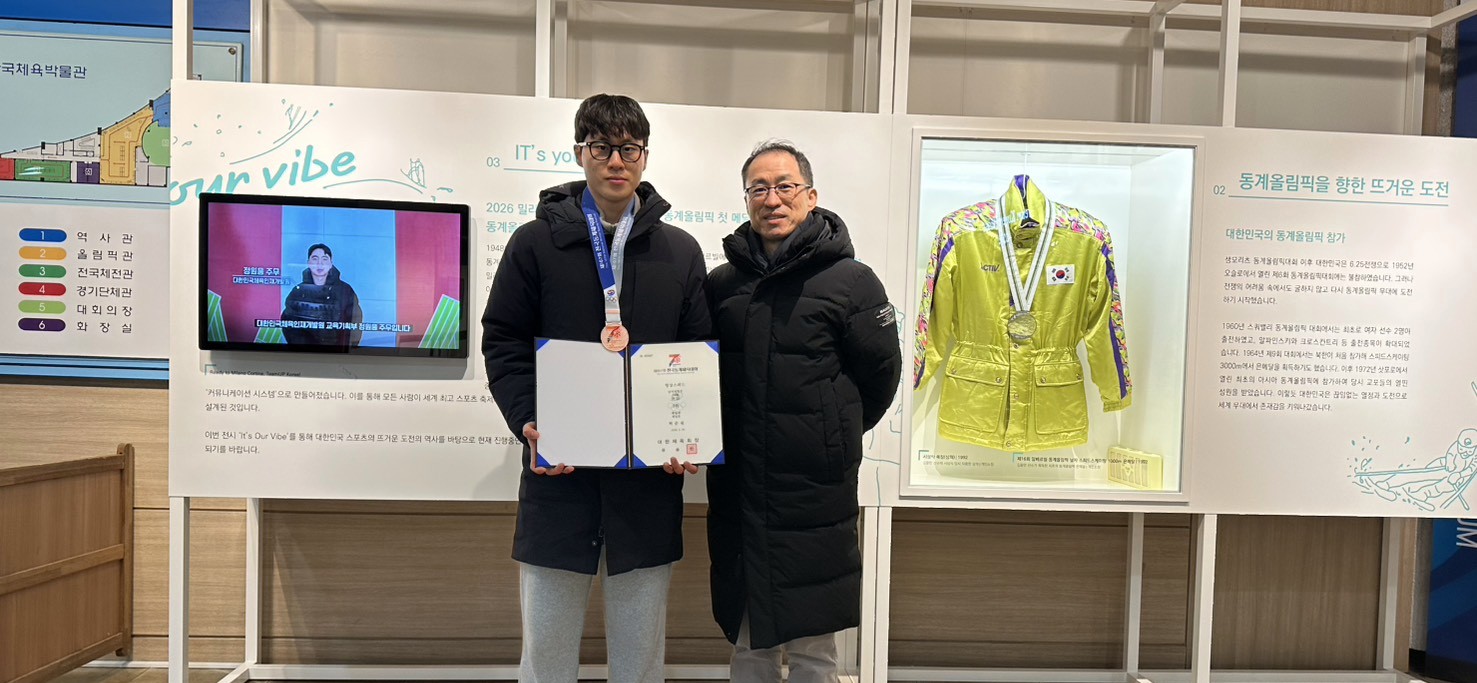 泰陵国際スケート場で開催している韓国冬季五輪挑戦史展示場前で銅メダルをかけて記念撮影する許峻瑗選手